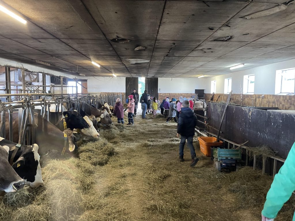Im Anschluss ging es für alle Kinder in den Kuhstall. Dort fütterten wir die Kühe mit einem Traktor und verteilten selbst gemachte Kuhpizzen.