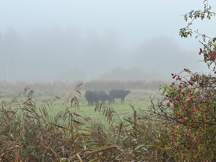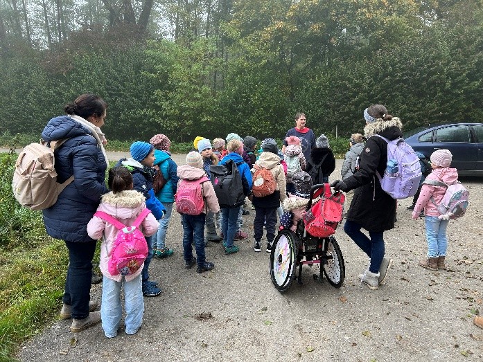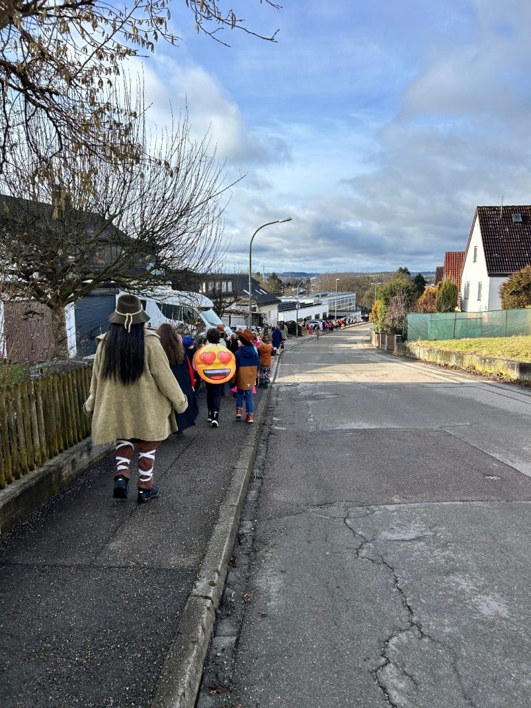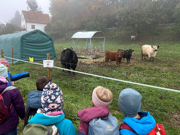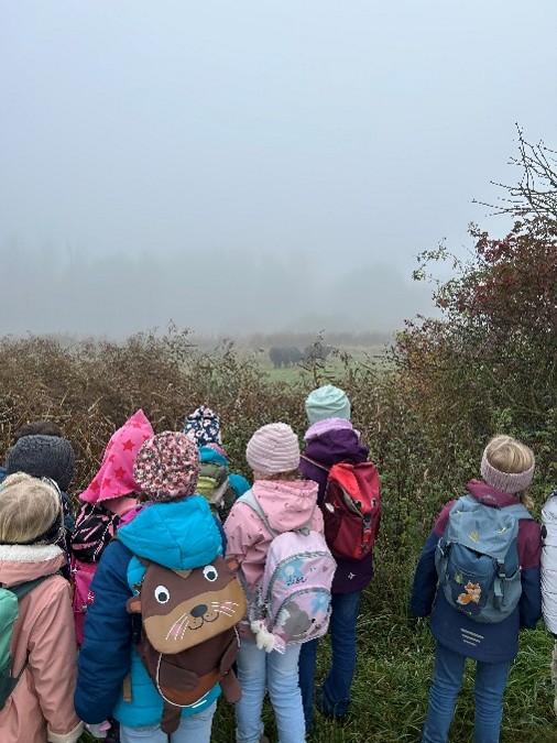 Die Klassen 1a und 1b unternahmen am 16.10.2025 einen gemeinsamen Spaziergang zu den Wasserbüffeln in Illerberg. Bei nebeligem und kühlem Wetter ging es gleich morgens los in Richtung Naturschutzgebiet, in welchem drei Wasserbüffeldamen als auch ihre mittlerweile drei Kälbchen beheimatet sind. Dort angekommen war die Enttäuschung zunächst groß, da die Tiere im vorhandenen Unterschlupf nicht anzutreffen waren.