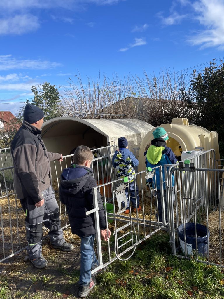 Den Anfang machten zwei Zwergkaninchen, dann besuchten wir gleich ein paar Häuser weiter eine ganz Hühnerschar nebst Kaninchen, die dort von zwei Kindern aus der Klasse gemeinsam gefüttert und versorgt werden.