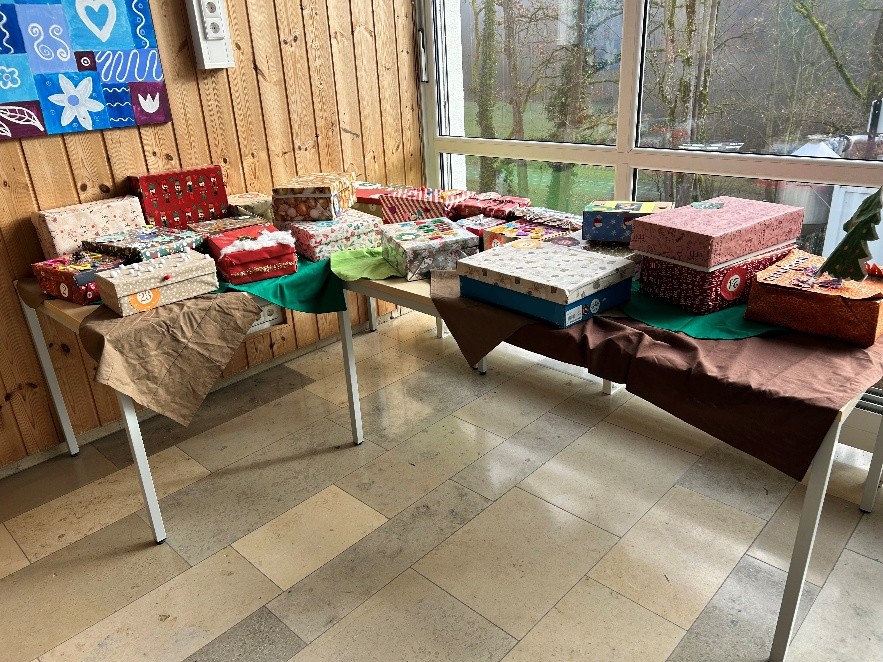 Wie bereits im letzten Schuljahr öffnen unsere Schülerinnen und Schüler aktuell täglich wieder den Schuladventskalender. Die 24 schön von den Kindern dekorierten Schuhkartons sind in der Aula aufgebaut. Jeden Morgen wird ein Karton von einem Kind einer Klasse geöffnet und per Lautsprecheranlage dann berichtet, welche Überraschung auf alle wartet, wie zum Beispiel hausaufgabenfrei, Musikpause oder extra Lesezeit.