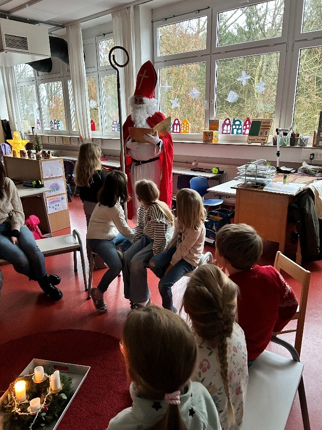 Am Freitag, den 5.12. wartete noch eine zusätzliche Überraschung auf die Schülerinnen und Schüler. Zunächst wurden die Kinder der Klassen 1 und 2 morgens vom Nikolaus besucht, der aus seinem goldenen Buch Lob und Tadel verlas. In der anschließenden Pause gab es dann Butterbrezeln und warmen Punsch für alle.